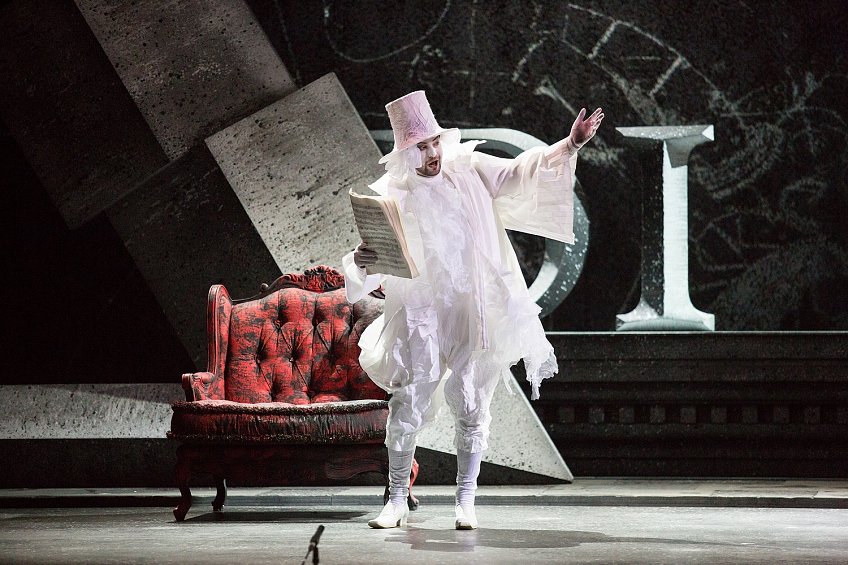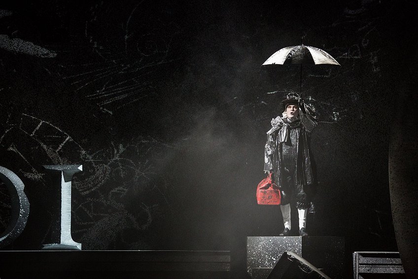 Задник заставлен объемными буквами «DIDO. The Prologue». Герои одеты в «бумажные» костюмы — черные и белые, а ведьмы (наставницы пансиона, по натуре — злобные фурии) щеголяют в серебристой фольге. Эней закован в «доспехи». Смесь хитонов и громадных античных шлемов с намеками на сценический костюм века барокко забавна и уютна, как чаепитие у камина. Если добавить к этому красный английский саквояж и чашечку кофе в руках Духа, на душе станет совсем хорошо.