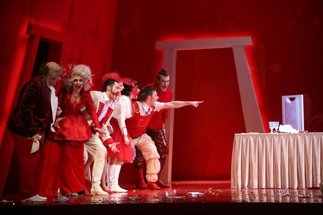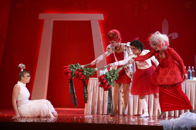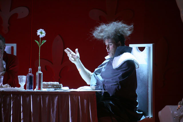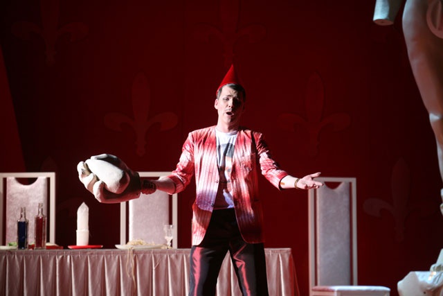 Более чем гиперболизированный гротеск спектакля облачен, однако, в очень стильную современную сценографическую оболочку и одет в эффектные костюмы, нарочито утрирующие средневековую площадную комедию «дель арте» (сценограф и художник по костюмам Виктор Герасименко).