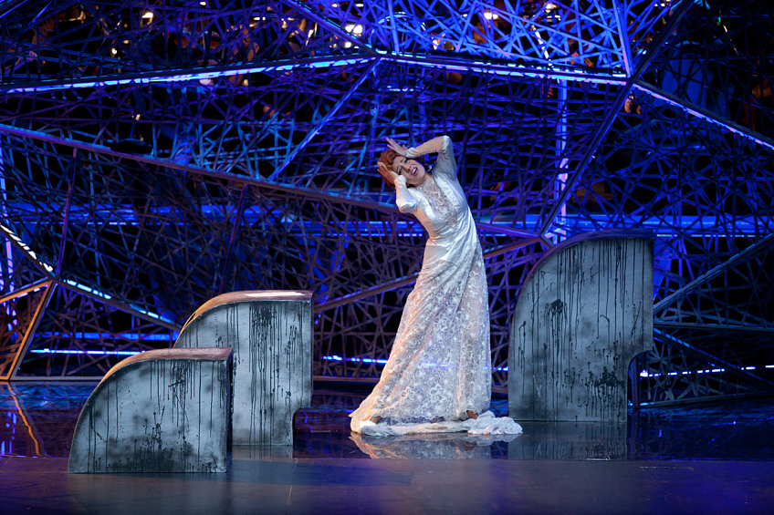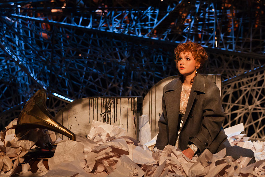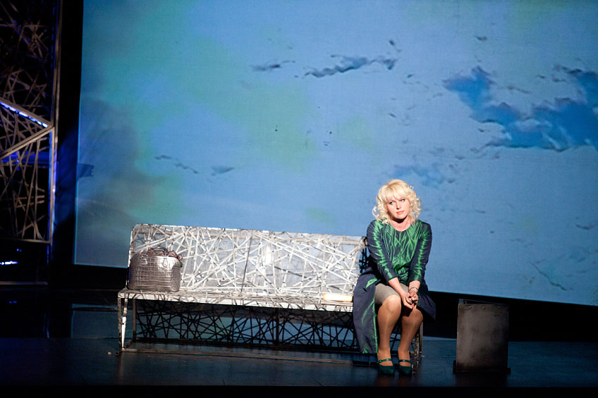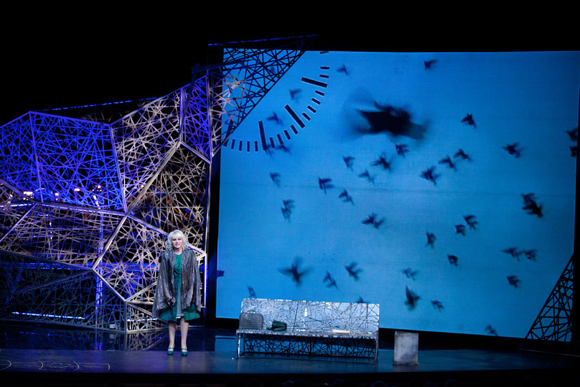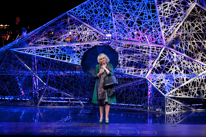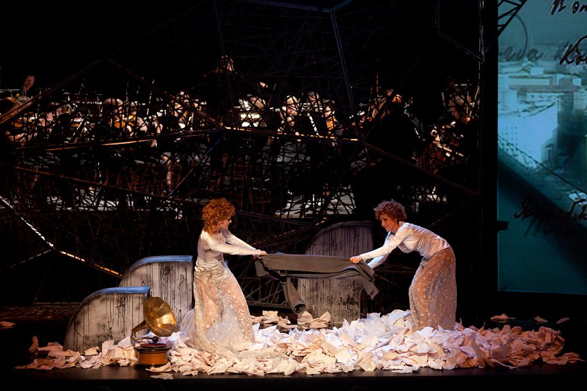Истории о женском одиночестве разыграны на авансцене, оркестр расположен сзади, и эмоции героинь льются крупным планом. На большом экране (основа сценографии) возникают улицы мегаполиса, на которые смотришь сверху, строки любовных посланий, покрытые слезами и кровью, шпили и призмы зданий хай-тек, а когда надо, трансляция игры героинь в режиме реального времени.