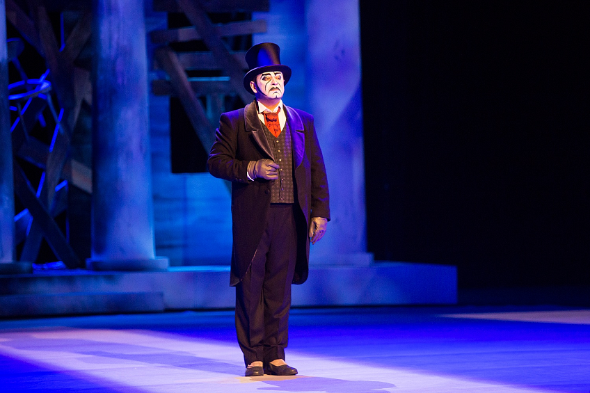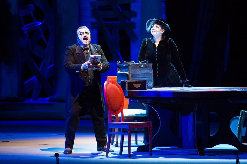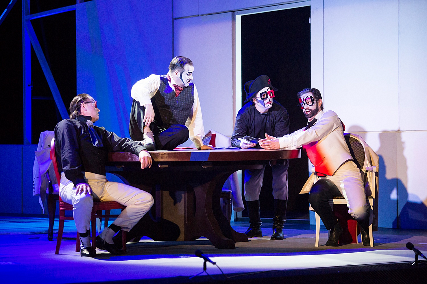 Второй спектакль – «Игроки» Шостаковича – стал открытием и откровением. Художественное оформление (сценография Дарьи Синцовой, костюмы Светланы Грищенковой) из достаточно условного, обобщенного стиля в первой части сдвинулось в область абстракционизма, точнее его крайней формы – супрематизма, но не только. Все решено на изобилии острых углов и контрастов: черно-бело-красные костюмы с острыми углами фраков и жилетов, круглый вертящийся карточный стол, разномастные стулья, геометрические фигуры на лицах актеров <...>