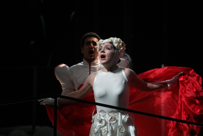Действие спектакля вполне оправданно происходит на двухуровневых декорациях: верхний уровень, где обитает Иоланта, декорирован белым, нижний уровень состоит из черных металлических панелей. Контраст между слепым царством Иоланты и зрячим миром еще больше подчеркивают костюмы — белые в окружении Иоланты и по-карнавальному яркие у остальных обитателей замка.