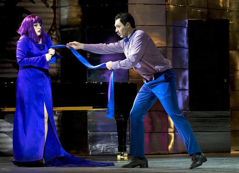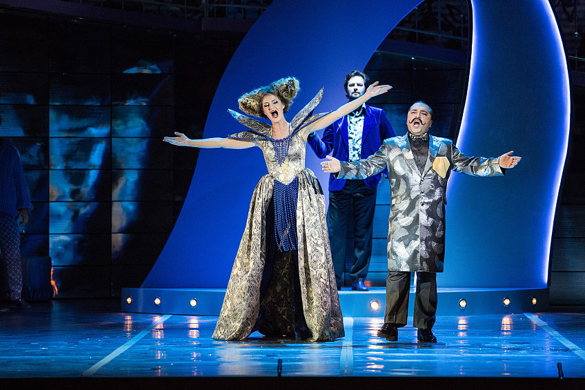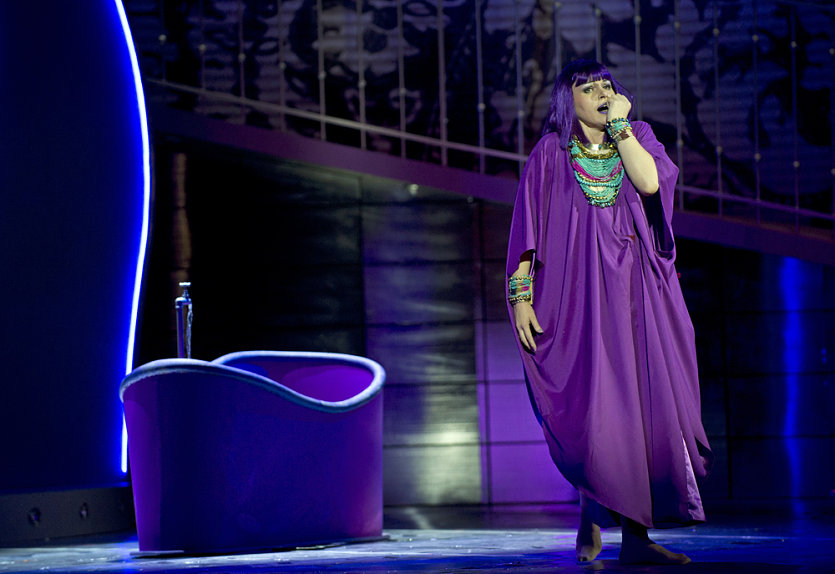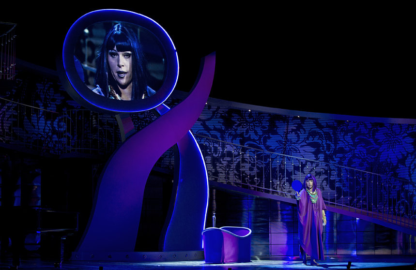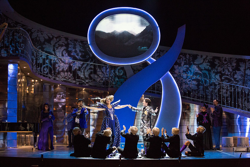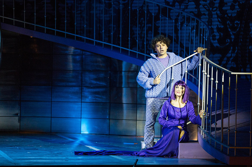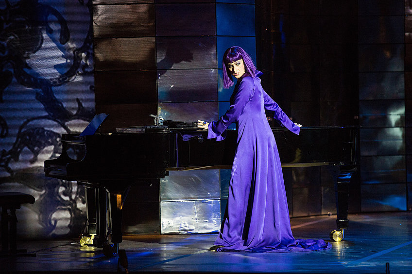 Дизайн спектакля — напористый: зеркальная стена и бегущая модерновой «волной» лестница, увенчанная арфой, зеркало-экран на гигантских ножках-стеблях, отражающий то лицо Мадлен, то подводный мир, населенный цветными рыбами, «безумные» фиолетовые парики и облачения героини, бутафорская ванна, куда Мадлен погружалась в финале, рассуждая томным голосом, кого ей предпочесть — поэта или композитора.