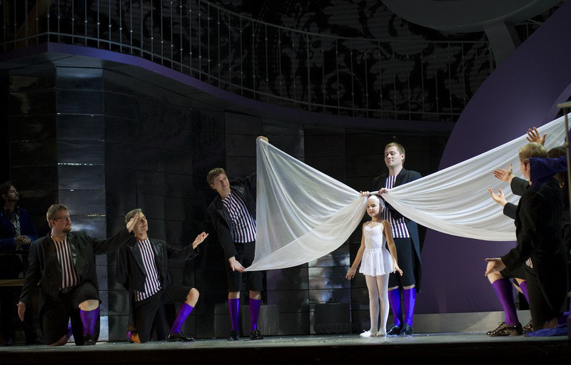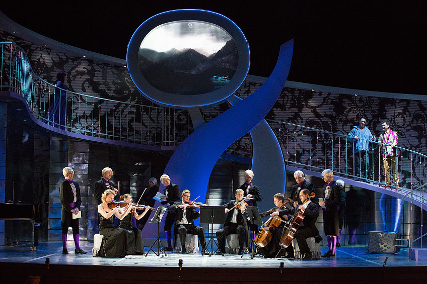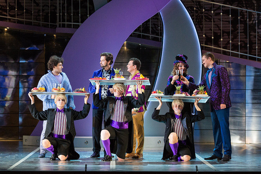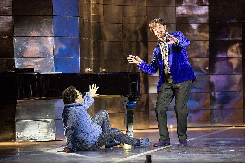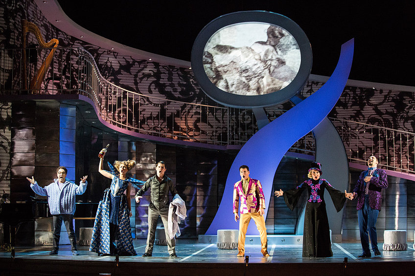 Плавные линии декораций к «Каприччио» навеяны музыкой оперы, которая отличается некой плавностью и незаостренностью самой темы. Там нет острых конфликтов, плавный разговор, беседа. Отсюда и пластика интерьера, в центре которого — лестница, незаконченность линий, подобно тому, как это используется в модерне. Но здесь нет модерна ни в перилах, ни в отделке. Я не прибегаю к стилизации, а использую смешанный стиль. Скорее всего, декорация напоминает современный павильон с большим количеством зеркал. Почему именно зеркала? Потому что в этой опере — «ненастоящесть», иллюзорность всего: отражение чувств, отражение любви, отражение персонажей.