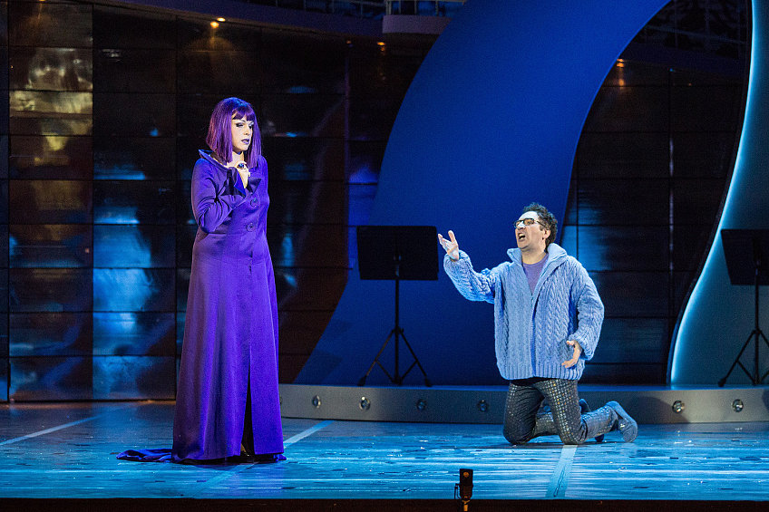 Молодой режиссер Алла Чепинога поставила «Каприччио» как гротесковый спектакль о человеческих взаимоотношениях. Любовный треугольник выходит на первый план и делает постановку понятной и увлекательной даже для слушателя, не обращающего внимание на многочисленные музыкальные шутки и цитаты. Художник Виктор Герасименко поместил героев в пародийно-гламурную обстановку в сиреневых тонах. Интеллектуальная утонченная музыка, режиссерская концепция оперы буффа и тонкая ирония художественного оформления — такое парадоксальное сочетание рождает на удивление гармоничный спектакль.
