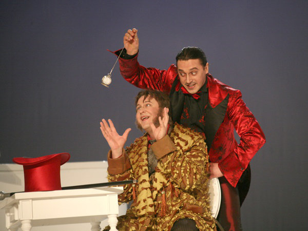 Очень часто, когда спрашиваешь у зрителей, только что посмотревших одну из постановок «Летучей мыши», почему она, собственно, так называется, они затрудняются ответить. Мне бы хотелось, чтобы, выйдя из зрительного зала после спектакля, человек это точно знал. В моей постановке центральной фигурой является доктор Фальк. Одетый в красное, он предстает перед зрителем неким злым гением, — затаившим обиду, выносившим план своей мести и на наших глазах его осуществившим. Он мстит своему бывшему другу Айзенштайну. Несколько лет назад сильно выпившие друзья возвращались с очередного маскарада: Айзенштайн — в костюме бабочки, а Фальк — в костюме летучей мыши. Айзенштайн, решив пошутить, оставил друга отсыпаться на лавочке, где тот и проснулся в разгар следующего дня. Естественно, возвращаться домой через весь город ему пришлось в карнавальном костюме. После чего к нему прикрепилось прозвище «доктор Летучая мышь». Простить такое своему другу Фальк не захотел и тщательно вынашивал план мести. Мы же узнаем, удалось ли ему осуществить задуманное.
