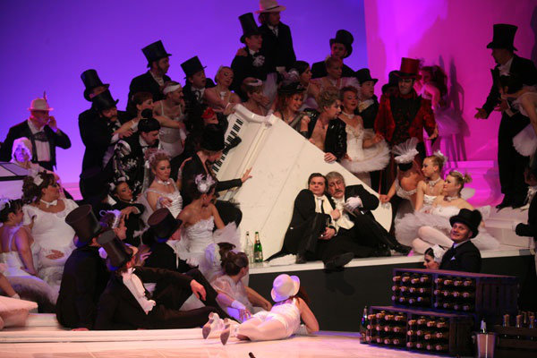 В своей работе Михил Дейкема и его коллега из Германии, художник по костюмам Клаудиа Дамм, постарались создать образ, который был бы одновременно историчен и близок современному человеку, поэтому мужчины здесь одеты во фраки, а девушки — в балетные пачки, костюмы, знакомые всем и почти не изменившиеся за последние полтора века. Изобретательна и эффектна сценография спектакля. Три пространства, в которых разворачивается действие оперетты — гостиная, бальный зал и тюрьма, — варианты одной комнаты. Но особый сюрреалистический эффект возникает в сцене бала, где все переворачивается с ног на голову, и люстра оказывается на полу, а люди-манекены свисают с потолка, напоминая группу летучих мышей!