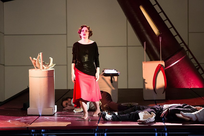 Декорации переносят зрителей в 1920–30-е годы. В архитектуре расцвет конструктивизма: герои страдают, мучаются и умирают в белом каркасном доме, собранном из многочисленных прямоугольных пластин. Кругом царит непроглядная тьма, в которой угадываются кружащиеся фигуры в черных одеяниях. Контраст вносят красный маяк позади дома и алая юбка Маддалены. Гнетущую обстановку подчеркивает сама героиня, пропев фразу: «Мне тяжело и скучно».