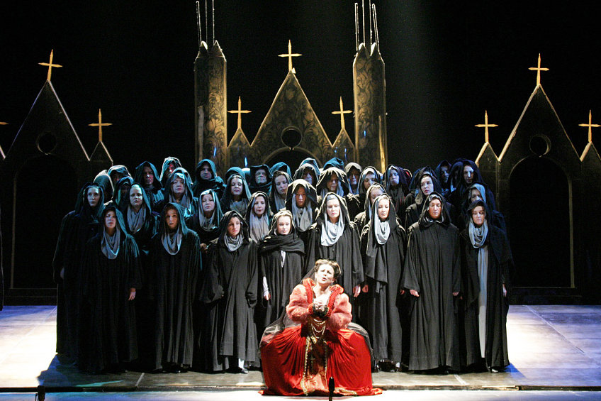 ...Новая Опера создает и утверждает жанр музыкального спектакля, полемизирующего с рутиной оперной условности. Постановочная простота, подчинение всего действия законам музыки позволяют буквально раствориться в ней. Грандиозные сцены с хором, самым знаменитым хором Доницетти, ... решаются монументально и строго.