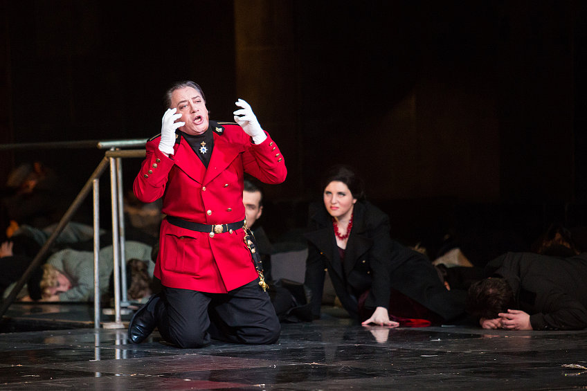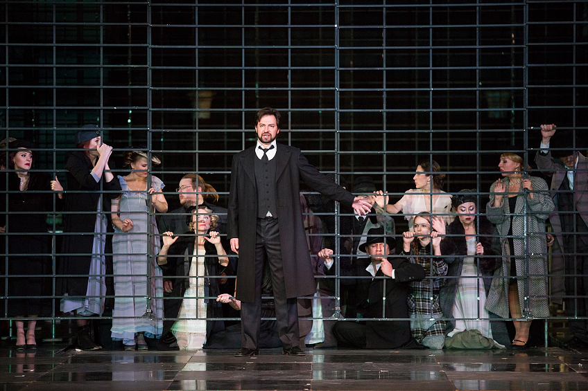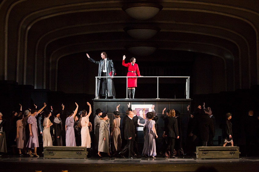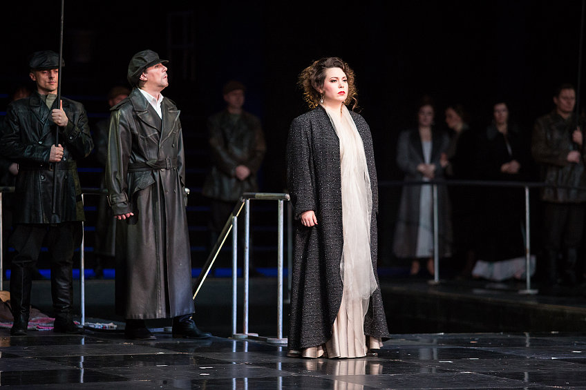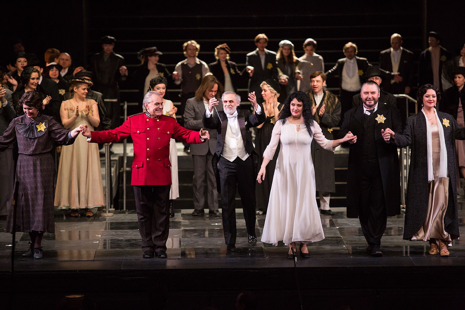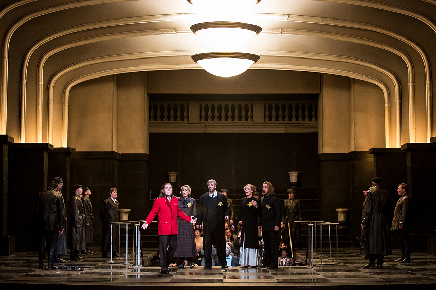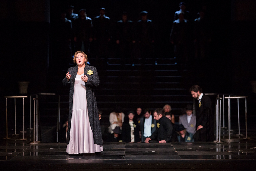«Набукко» – спектакль о насилии, о том, как военное меньшинство мучает мирное население, чья жизнь внезапно оказалась под угрозой. Одна из ассоциаций – судьба еврейского народа во времена фашизма – на это указывают желтые звезды и дети со скрипками. Однако сама ситуация, когда заложниками группы людей в кожаных пальто становятся беззащитные граждане, вызывает воспоминания о современном терроре. Музыка Верди не сопротивляется такому подходу, напротив, ее жесткие маршевые ритмы и сюжет о внутрисемейной борьбе за власть рассказывают о том, что происходящее ужасно. Ждать от такой истории традиционного оперного благолепия – некой красивой картинки — означает не слышать внутреннюю боль музыки, которая и во времена Верди (мировая премьера в 1842-м в Ла Скала) воспринималась как политический театр (знаменитый хор пленных иудеев был неофициальным гимном Италии, борющейся с политическим гнетом Австрийской империи). Но грандиозность этого сочинения, с которого начался великий Верди, проявлена вполне. Звуковой напор, создаваемый солистами и оркестром Новой Оперы, так велик, что грохот проходящего в финале поезда, под которым гибнет героиня, оказывается кульминацией спектакля.