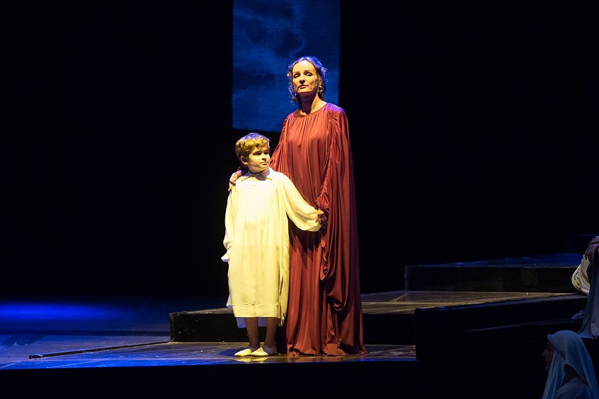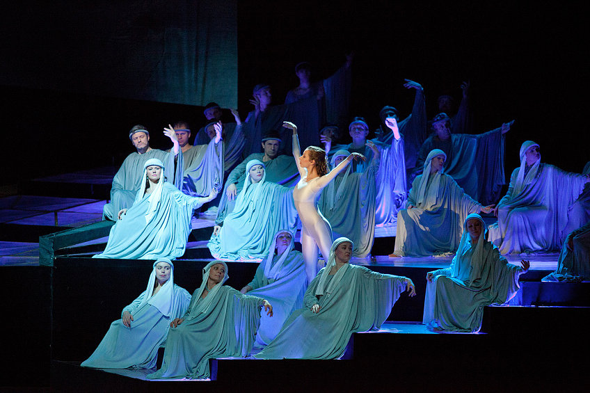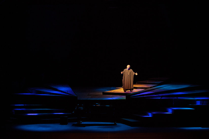 Пространство сцены сконструировано таким образом, что становится очевидно, каким маленьким является человек в этом огромном мире, где все решает божественное Провидение.