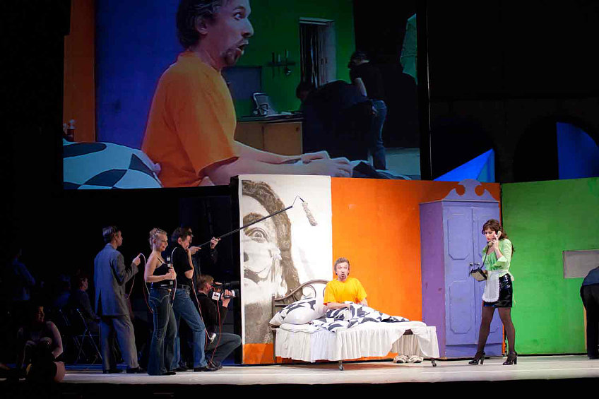 Кари Хейсканен:«Что касается концепции, то обычно я стараюсь избегать традиционного подхода. Вот почему я решил ввести в спектакль съемочную группу. Это очень короткая опера, поэтому она должна быть максимально правдивой. Для меня кино и телевидение — неотъемлемый и очень важный элемент современной жизни».
