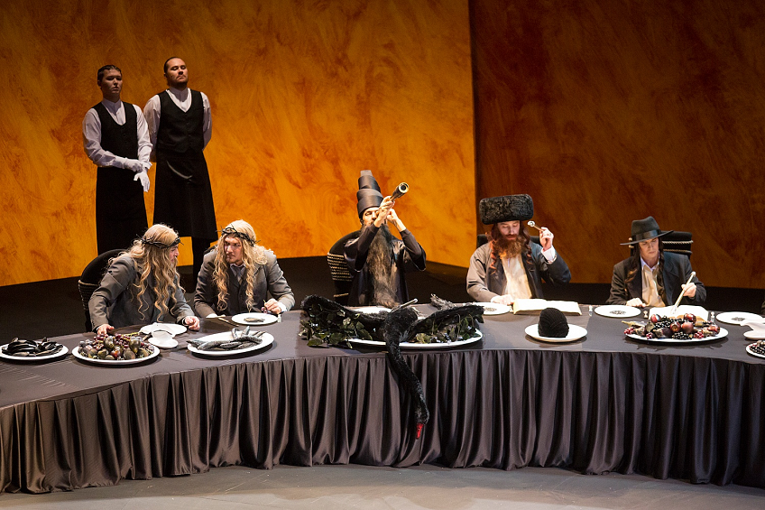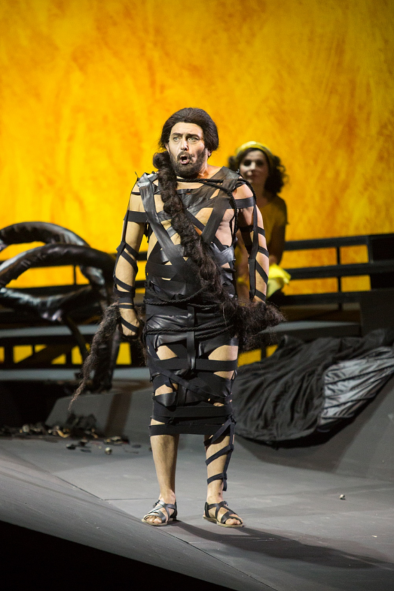 Достаточно аскетичная, но эффектная сценография – наклонные черные полы, образующие изломанную воронку в центре сцены, полукруглая стена под желтый мрамор (в трагические моменты окрашивающаяся багрянцем),черный стол с черной едой, черно-бело-желтые костюмы (за единственным исключением Иоканаана) по моде достаточно широкого временного отрезка начала XX века – все это вполне имеет право быть. Основной элемент, притягивающий внимание – эффектная увивающаяся ввысь черная конструкция (переплетение корней южного дерева или лиан из графики модерна, а может быть это провода или даже молекула ДНК). Ее рисунок многократно повторяется визуально – длинные волосы Саломеи и Иоканаана, пейсы у иудеев, терновые венки у назарян…