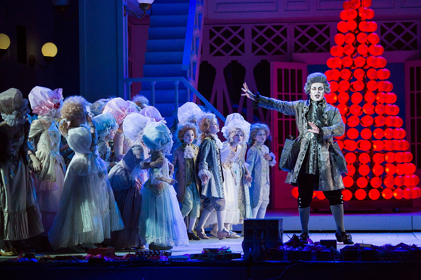 Спектакль получился очень красивым: затейливые костюмы с рюшами, чепчиками и высокими париками, елка из алых шаров, мыши-роботы, сверкающие красными огоньками глазниц и зловеще мотающие головами, белоснежный дом Штальбаумов с парадными лестницами и непременным циферблатом часов в первом действии, и огромное кресло (чтобы все куклы выглядели, как и полагается, маленькими) – во втором. Атмосфера действительно праздничная и, как полагается на Рождество, волшебная.