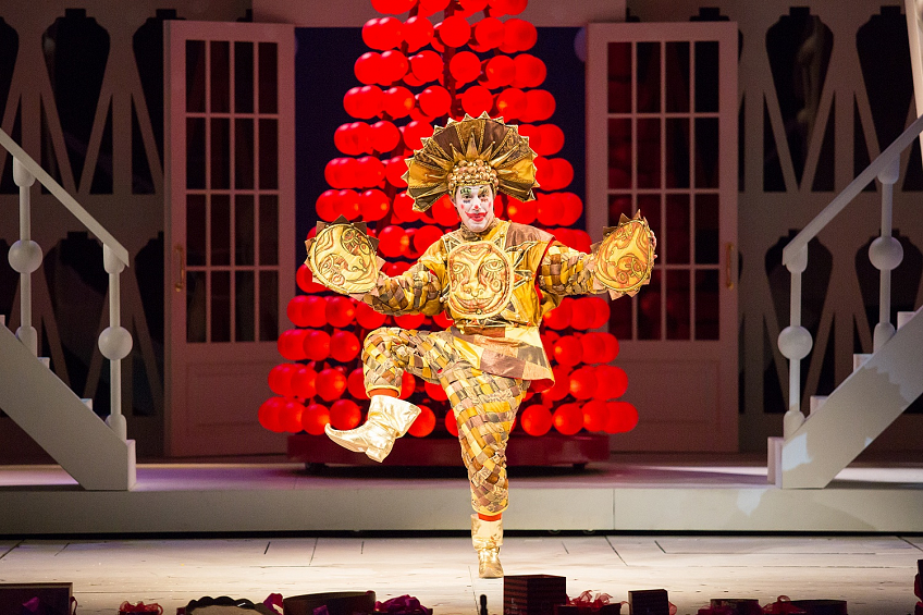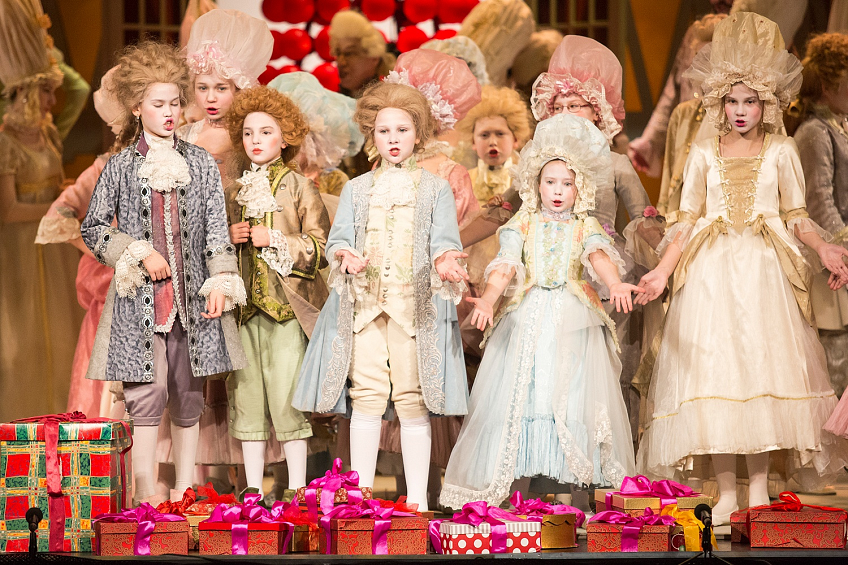 И оркестр привычно ворожит, сцена, как положено, изображает старинный городок под снегом, мимо светящихся окон чинно ходят господа и госпожи, бегают стайки ребят, которых куда-то ведет таинственный мастер хитрых игрушек Дроссельмейер… Вдруг он начинает петь – а за ним и дети на хрестоматийный «Марш оловянных солдатиков» исполняют веселый хорик. Сцена превращается в освещенную залу дома советника Штальбаума. «Вот игрушка не для всех» – на забавно прихрамывающую тему фантастической мазурки Дроссельмейер представляет детям куклу-щелкунчика. Всех отталкивает вид огромных челюстей, одна Маша чувствует жалость к деревянному зубастику, в чем признается нежным сопрано.