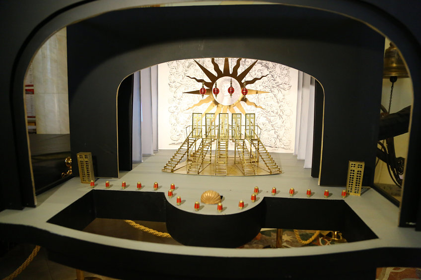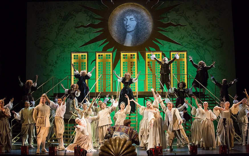 Мы хотели отразить в декорациях и театр Мольера, и одновременно изящную эпоху Людовика XIV. Двери на авансцене, люстры в пустом пространстве — все это стилизация, которая создает театральную и дворцовую атмосферу. Центральным элементом декораций станет ажурная металлическая конструкция из лестниц и дверей, легкая и пронизанная светом, а задник украсит огромный портрет Людовика XIV, помещенный в центр солнечного круга с расходящимися во все стороны лучам.