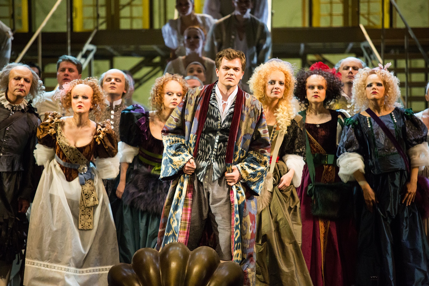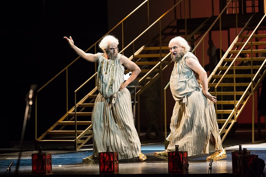 Тут и там мелькают лоскутки то Вагнера, то Верди, то Люлли, намеки на Стравинского и Доницетти, на Рихарда Штрауса и мюзикловую попсу. Некоторые стилизованные эпизоды повторяются многократно — например, мажорное аллегро в духе раннего классицизма и фанфарная тема с восходящей гаммой, отсылающая к токкате из Орфея Монтеверди. Оркестр, которым дирижирует Дмитрий Юровский, справляется с этим жонглированием, надо признать, довольно ловко.
