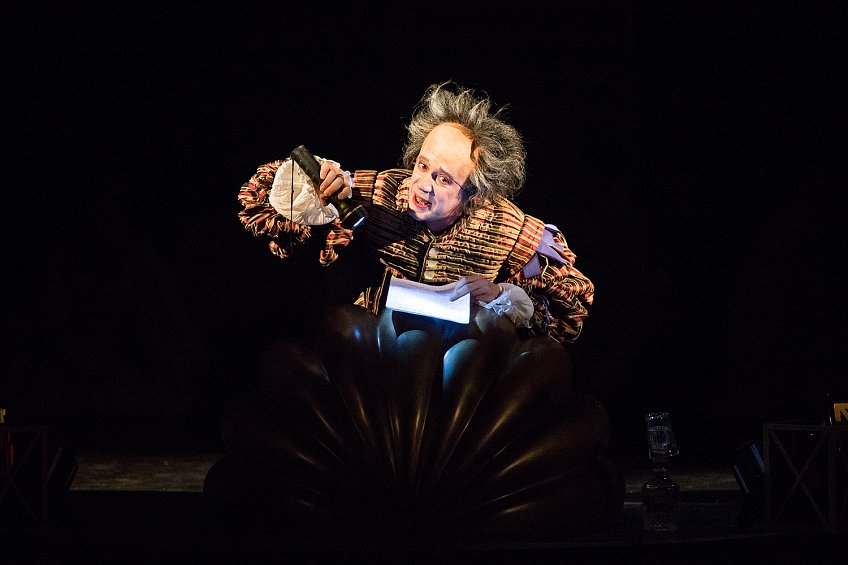 Занавеса, конечно, нет, и до начала мы наблюдаем за «кухней»: уборщицы в синих комбинезонах вытирают пыль, рабочие носят реквизит, кто-то подтягивает корсет, разминает конечности и пьет чай из термоса; кто-то, лежа на животе и свесив голову в оркестр, болтает с музыкантами. Но вот и действие: на табло для титров загорается надпись «Тихо, идет репетиция», а нервный режиссер в халате ругается с заведомо бездарными подчиненными. «Сойду с ума, сойду с ума» — кокетливо повторяет Мольер. «Чего от нас хотите вы?» — бесконечно распевает труппа.