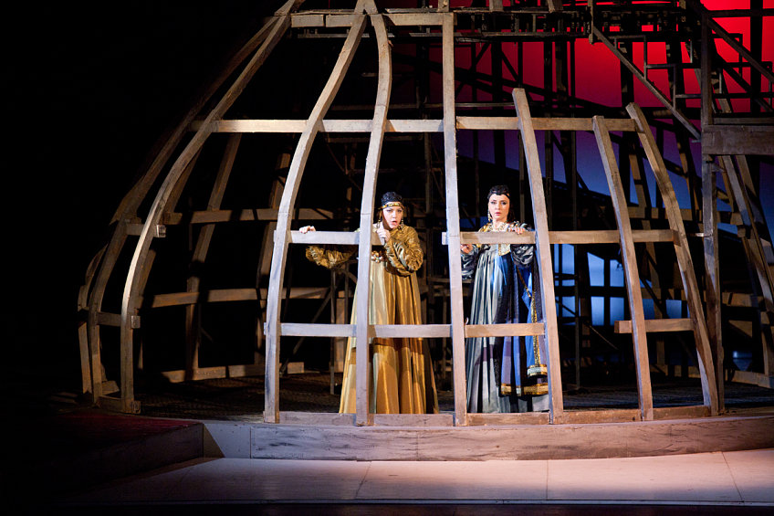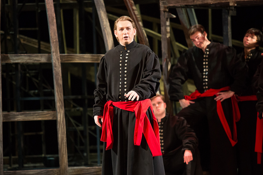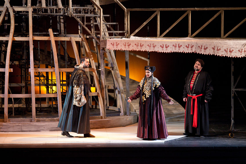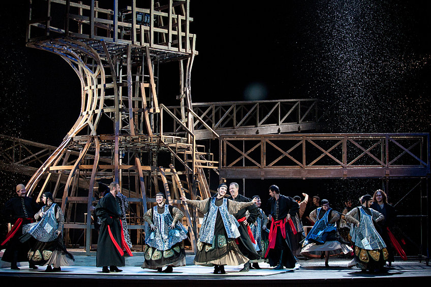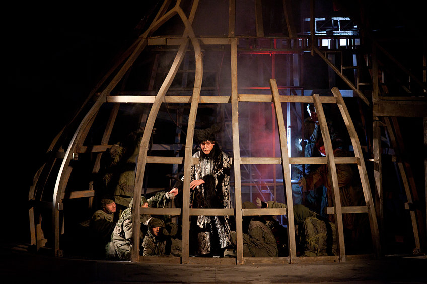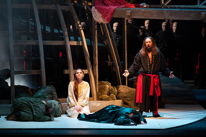 В центре сценографической конструкции — остов дозорной башни, формой напоминающий женское тело; от «башни» отходят подвижные мостки, внутри — винтовые лесенки и переходы; а часть оркестровой ямы перекрывает помост, где разыгрывается значительная часть ключевых моментов сюжета и в особенности символические эпизоды представления. Открывается спектакль не увертюрой, а хором а капелла, под который, истово крестясь, выходят на помост со свечками и массовка, и основные действующие лица, и только вслед за этим «парадом алле» действие переносится в дом Грязного.