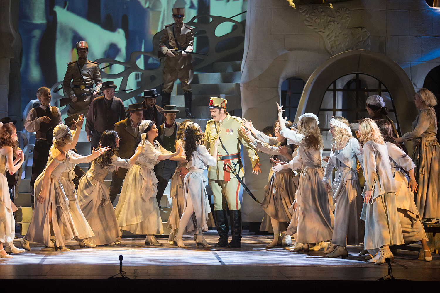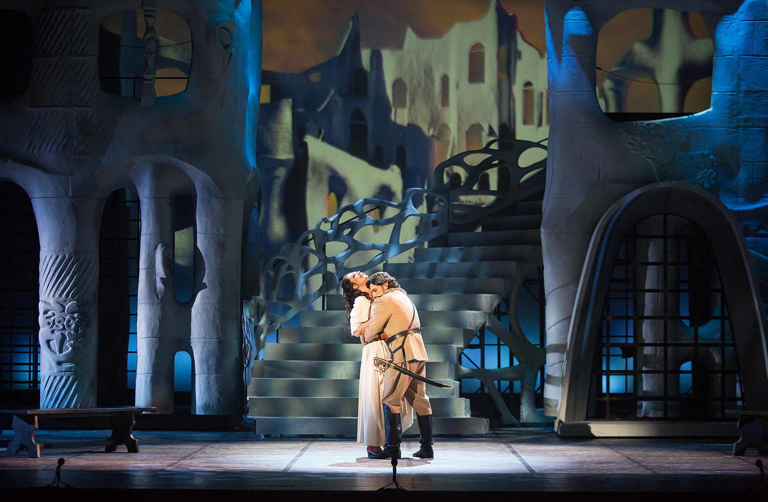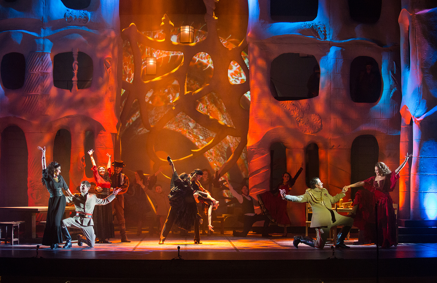 Режиссерский замысел органично раскрылся в художественном оформлении Вячеслава Окунева, по-своему подчеркнувшего испанский колорит, – он создал сценографию по мотивам архитектуры знаменитого каталонца Антонио Гауди, чьи конструкции воплощают фантастические миры самой природы. В спектакле они олицетворяют и естественный фон жизни, дополненный видеоартом на заднике сцены, и ту среду, из которой вышли герои оперы. Немаловажную роль играют и световые решения, выполненные Сергеем Скорнецким – они, как и у Гауди, придававшего свету немало значения, вносят дополнительные смыслы в сценические образы. Вячеслав Окунев выбирает цветовую гамму костюмов также близкую к природным элементам – охристые, белые и серые тона создают монохромный ряд, который «взрывается» изобилием красок национального колорита лишь в последнем действии, усиливая ярким контрастом трагизм последней сцены…