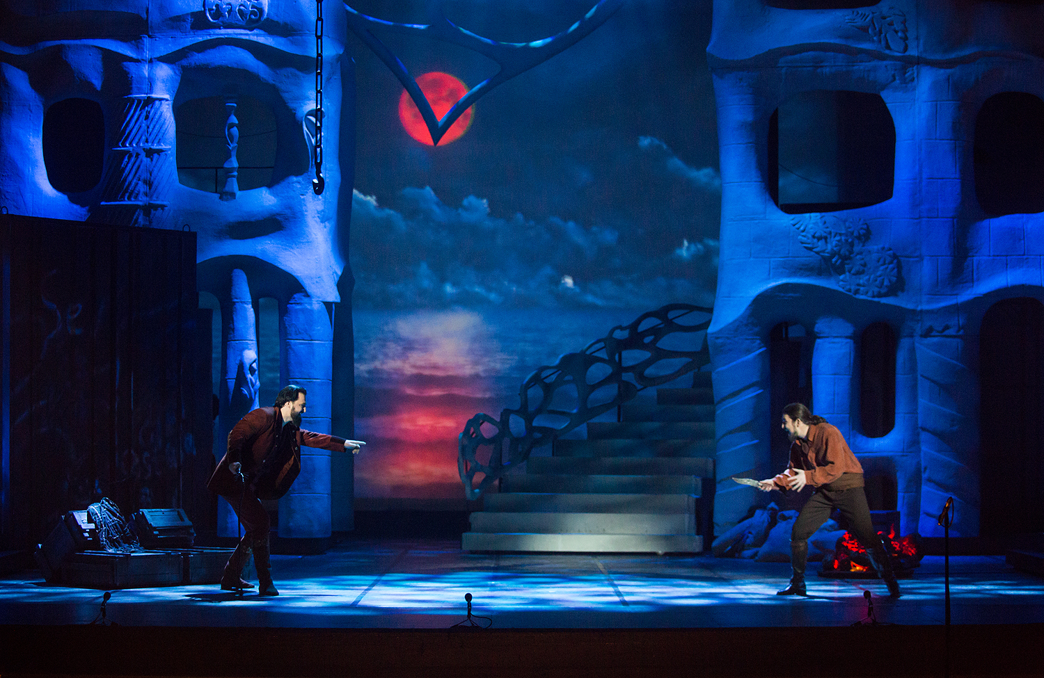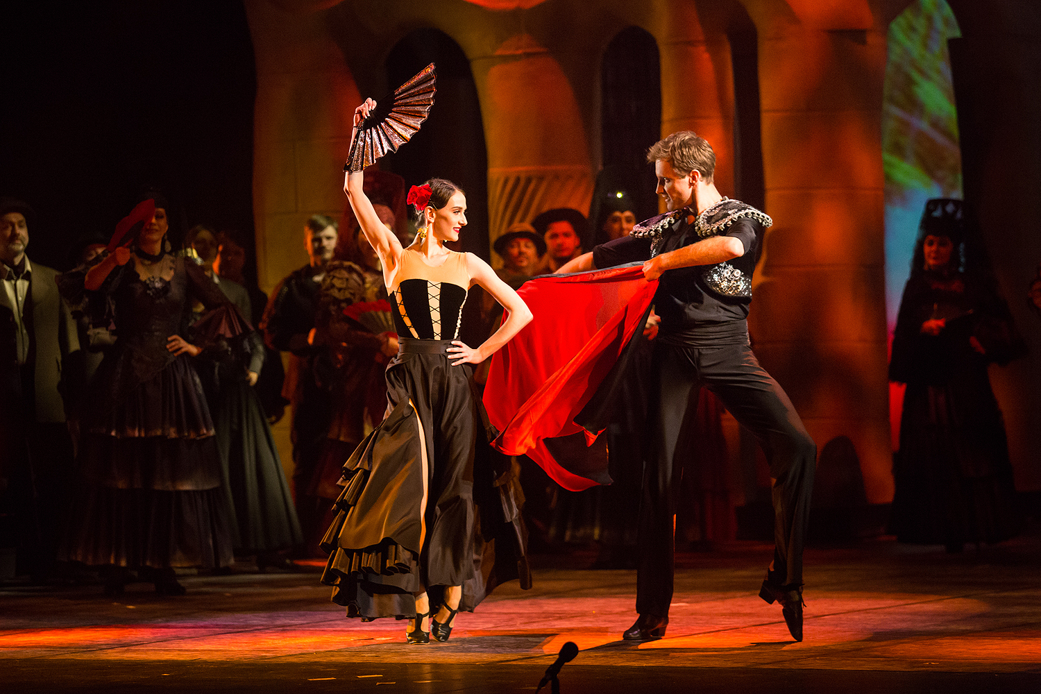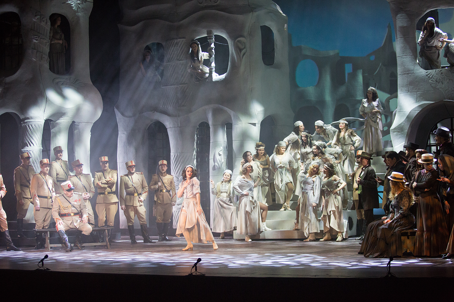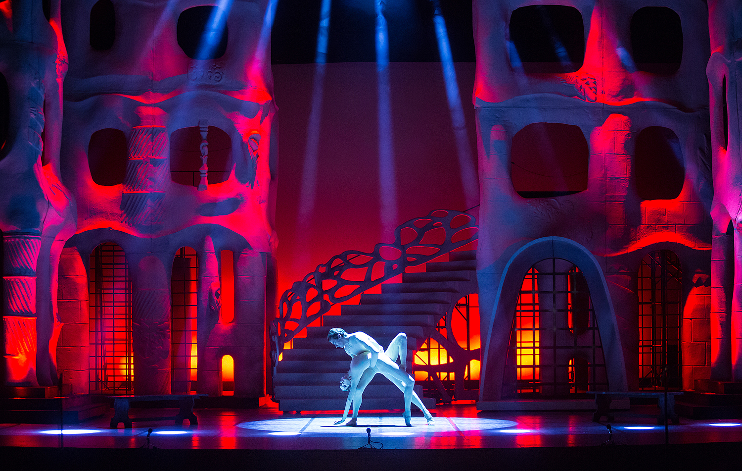 Режиссерский замысел органично раскрылся в художественном оформлении Вячеслава Окунева, по-своему подчеркнувшего испанский колорит, – он создал сценографию по мотивам архитектуры знаменитого каталонца Антонио Гауди, чьи конструкции воплощают фантастические миры самой природы. В спектакле они олицетворяют и естественный фон жизни, дополненный видеоартом на заднике сцены, и ту среду, из которой вышли герои оперы. Немаловажную роль играют и световые решения, выполненные Сергеем Скорнецким – они, как и у Гауди, придававшего свету немало значения, вносят дополнительные смыслы в сценические образы. Вячеслав Окунев выбирает цветовую гамму костюмов также близкую к природным элементам – охристые, белые и серые тона создают монохромный ряд, который «взрывается» изобилием красок национального колорита лишь в последнем действии, усиливая ярким контрастом трагизм последней сцены…