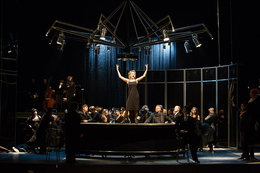Ярким краскам в этой постановке предпочтен черный цвет. «Травиата» в Новой Опере не романтическая история любви, а трагический рассказ о ее гибели. Смертью Виолетты начинается и заканчивается спектакль. А в промежутке она, как раненая птица, бьется, мечется, пытается вырваться из замкнутого круга собственной судьбы.