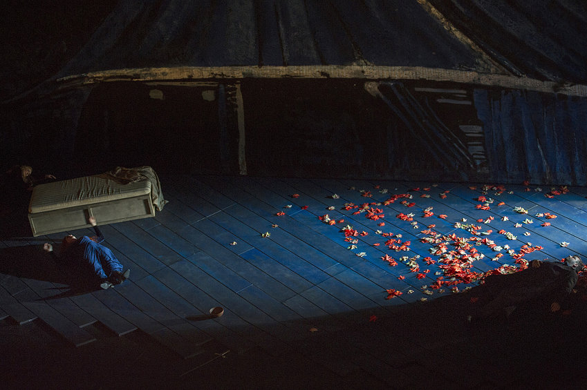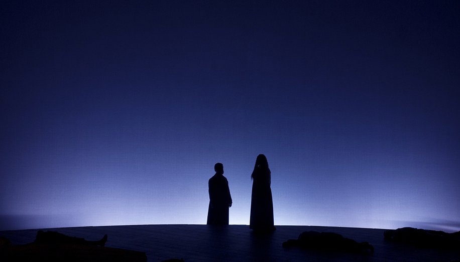 Это не изъян, а скрытая тема постановки: Тристан и Изольда в ней словно принадлежат разным эпохам. Изольда – языческая ворожея, часть природы, налитая соками растительного здоровья. Такие, умерев, тут же обратно выпадают на землю в виде животворных осадков. Тристан – изначально проигравший индивидуалист нового времени, обреченный на одиночество и смерть.