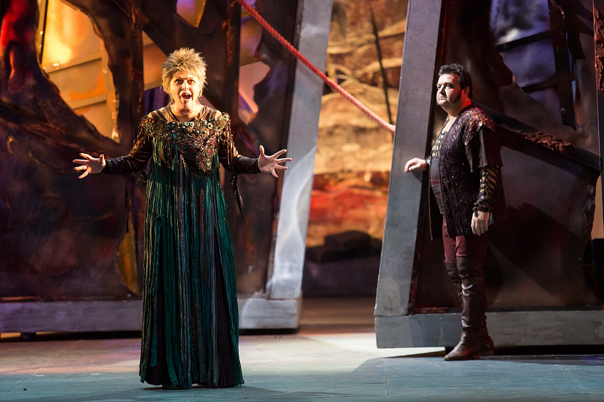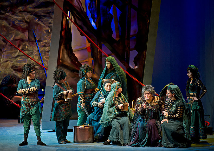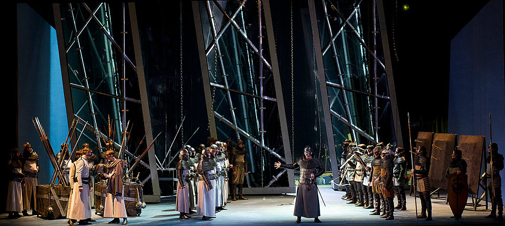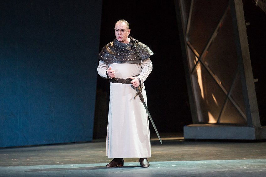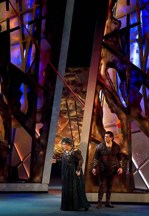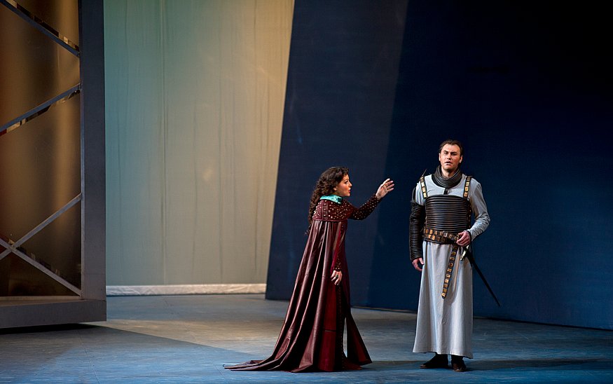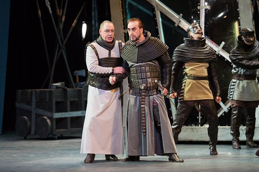 Сценография новооперного «Трубадура» использует свою возросшую роль в оперном спектакле на сто процентов. Она условна и не привязана к эпохе, она архитектонична и хорошо выражает экспрессивную атмосферу сценического действия своим агрессивно угловатым конструктивизмом мрачных искоса нависших «пизанских» башен. Все читаемо, прозрачно и… театрально. Только театральность здесь предельно условная, ровным счетом такая, в которой нуждается опера для визуализации своей музыкальной ткани, и не более того.