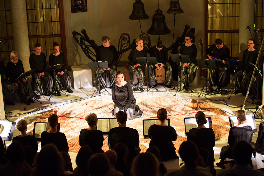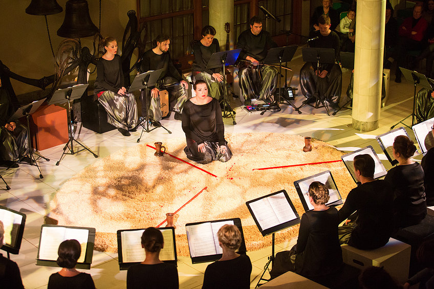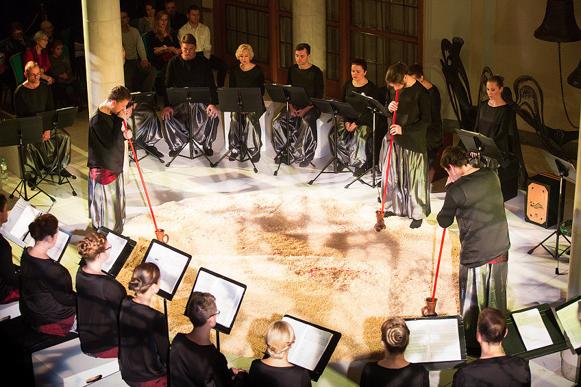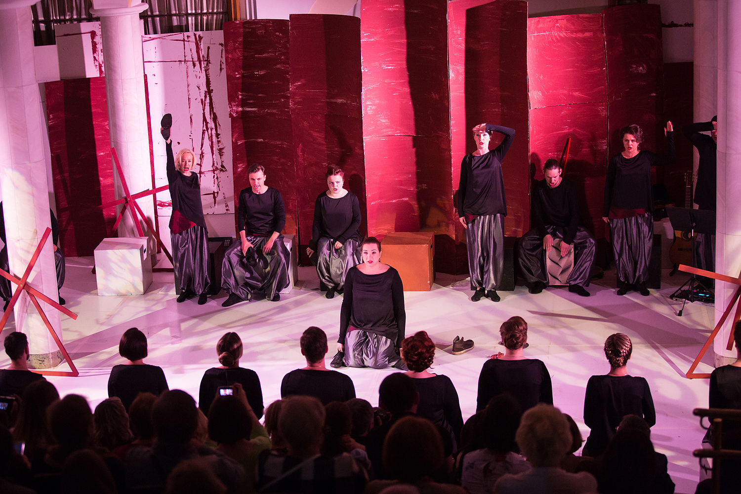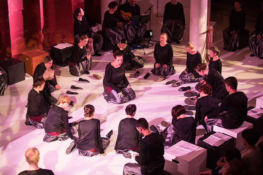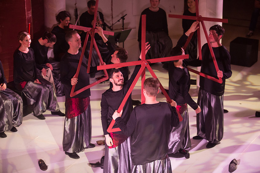 Премьера «Красного» состоялась в 2017 году в Зеркальном фойе театра. Но теперь, когда постановка проходит на сцене Новой Оперы, это уже совсем иной спектакль. Другие декорации, другие мизансцены, дополненные постановочным освещением (художник по свету – Майя Шавдатуашвили) и тематическим видеорядом. Все это позволяет по-новому ощутить уже знакомый спектакль и его музыку. «Красное» – заключительная часть триптиха-исследования иных людей, созданного режиссером Алексеем Вэйро, хормейстером Юлией Сенюковой и художником Этель Иошпой.