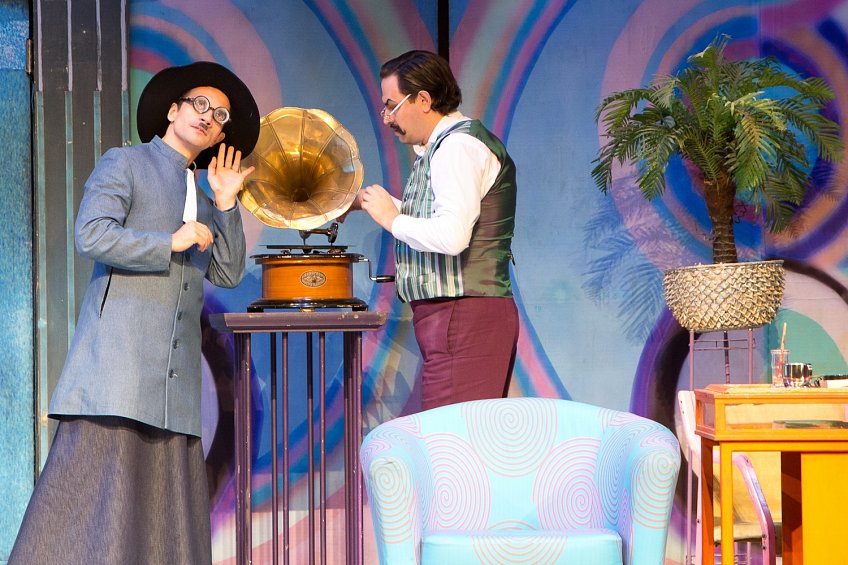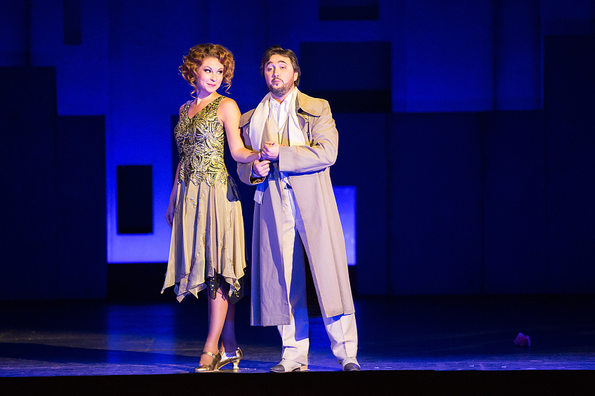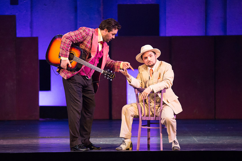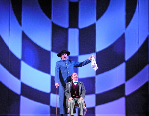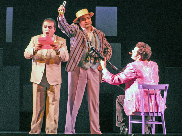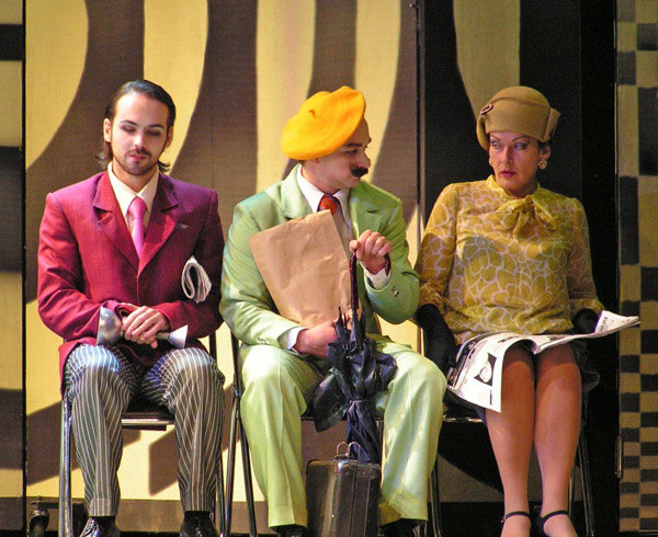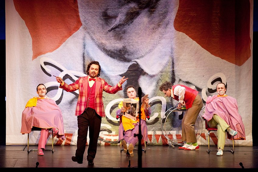 Одетая в художественный облик начала прошлого века и приправленная элементами чаплинского гротеска, старая добрая опера Россини получает неожиданно яркое звучание. Ее тонко разработанные персонажи-характеры оживают в новых условиях. Но это не немое черно-белое кино. Лишь костюмы-котелки-трости тех лет отсылают к конкретной эпохе, да нечеткая черно-белая шахматно-сферическая графика занавеса… А все, что происходит за этим занавесом, брызжет яркими цветами и живет сочной и звучной жизнью.
